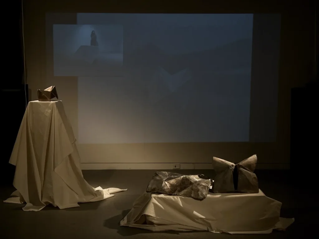 I am drawn to questions about how an object can exist on camera and to the possibilities that come from playing with scale. Recently, I have been working with the paper fortune teller, or chatterbox, as a sculptural form; I am interested in whether its extraction from context and its interaction with the performer can free it from the burden of its cultural associations. I wonder whether such gestures open up new possibilities and new ways of seeing the object, or whether a chatterbox will always remain a chatterbox. I work with a variety of materials, and I have cast the chatterbox in aluminum and bronze to give it a solidity it does not naturally possess. I have also experimented with different kinds of cameras to explore various aspects of its materiality. Here is a snipper from an experiment with the SANDIN image processor, where I attempted to work with the form stripped of any narrative structure.
